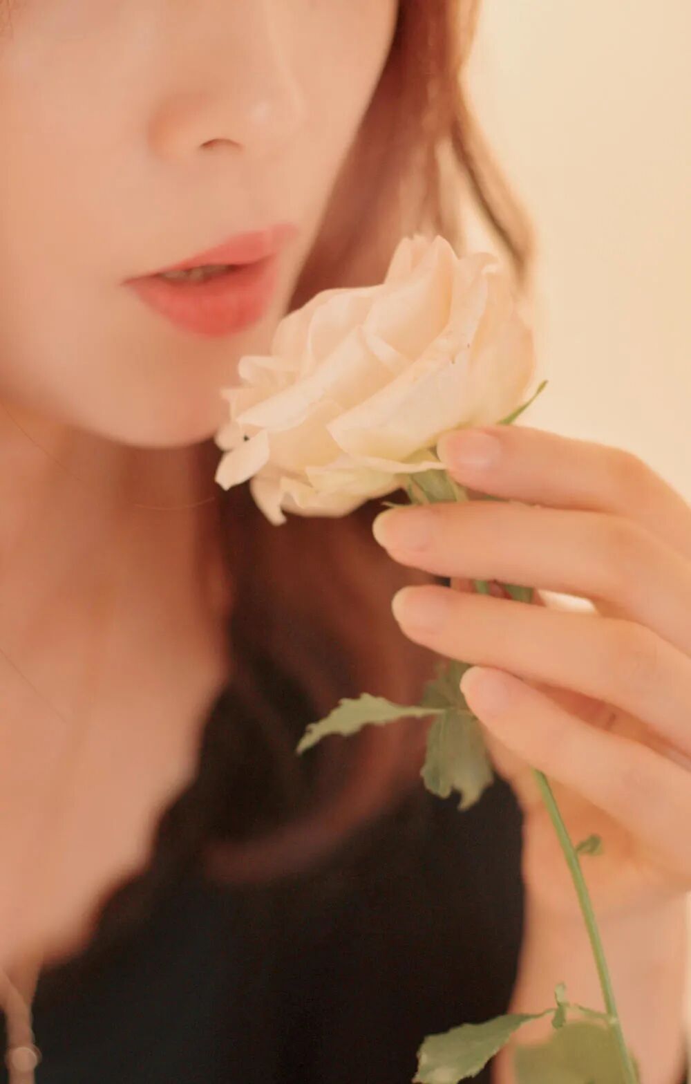 你问到构图了,我就说说构图。我觉得画面下面很大面积其实没什么用。人物面部给了局部特写,既然是特写,我觉优先考虑居中构图比较好。嘴和花在画面中占面积挺大的,居中也没问题。