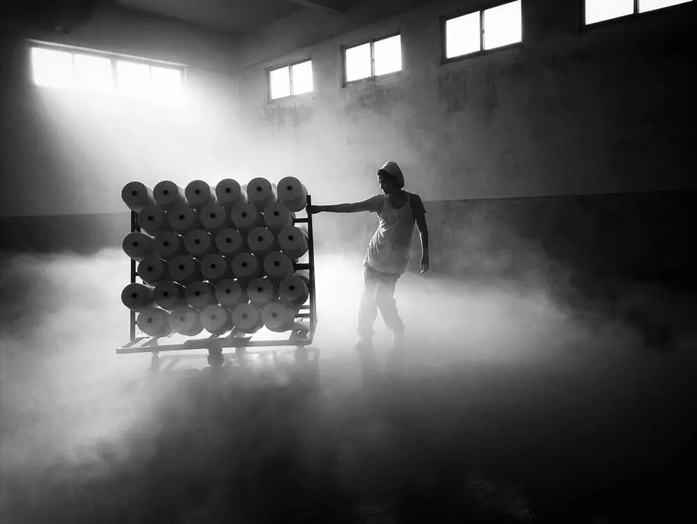 劳动最光荣纺织女工把蒸好的纱从车间拉出来,蒸汽刚刚散去,仍有少许缭绕。视线不是很好,因此整成黑白。