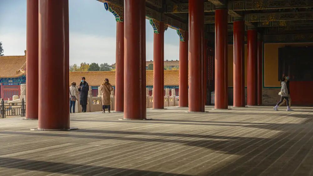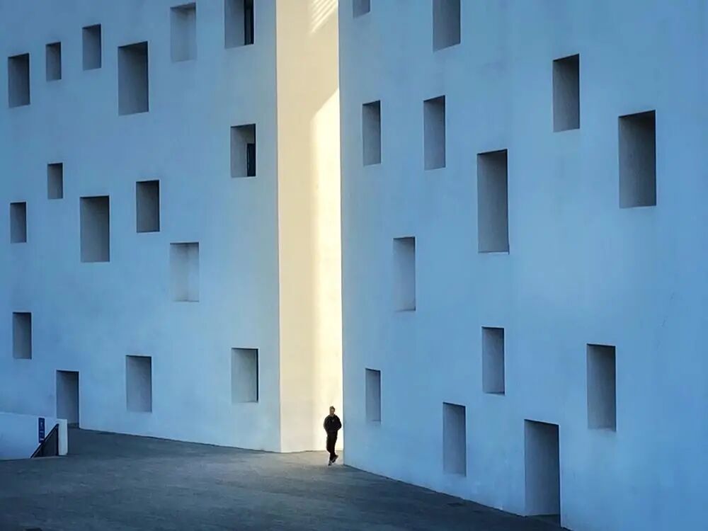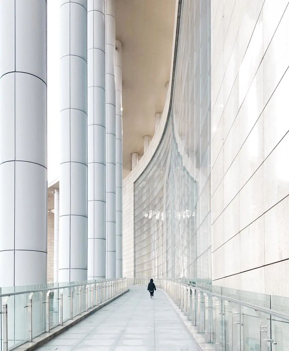 但是吧,这个取景的范围尽量干净。左下角那个往下走的楼梯都是多余。为什么不考虑竖构图呢?人就这么压得低低的。能够显示出这个地方建筑的高大。我觉得会特别有感觉。
