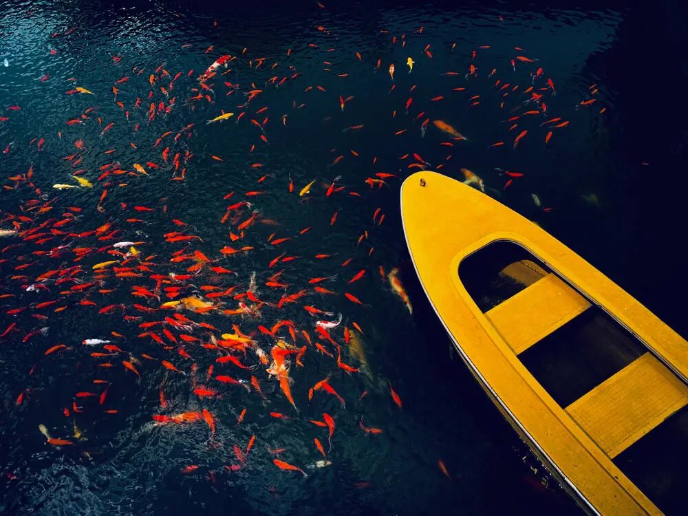 点评:挺撞色的一张照片。不错挺好看的。黄色的船和红色鱼与深蓝色的水形成了比较强烈的对比。真的是挺好看的。