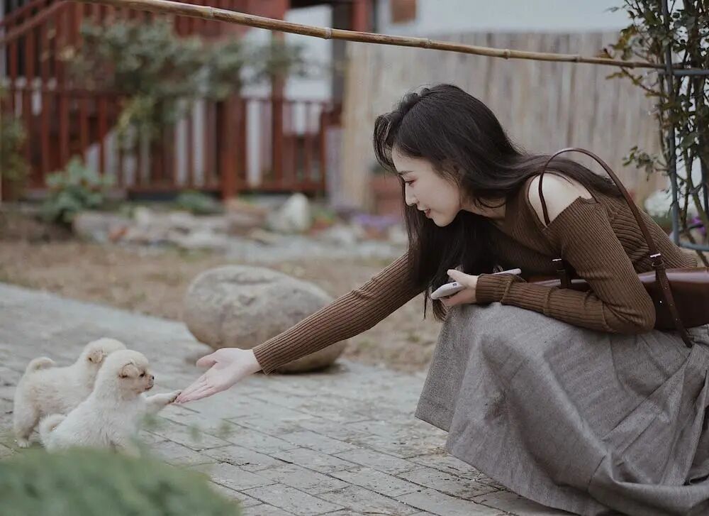 点评:这个瞬间真的不错。因为小姐姐专注于小狗。所以姑娘的状态很好。非常自然。