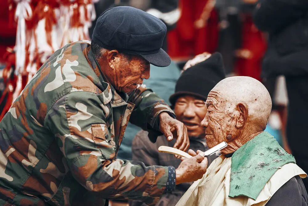 先说取景,缩小取景范围,更加聚焦在老人脸上。脸上的褶皱就说明一切了。不需要周围环境什么的。身上的服饰可以点明民族信息。处理很干净利落。