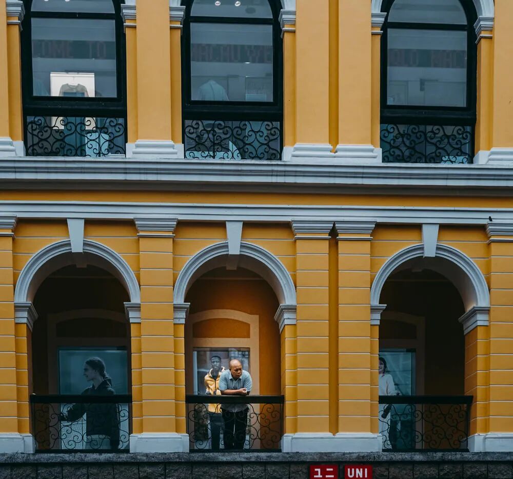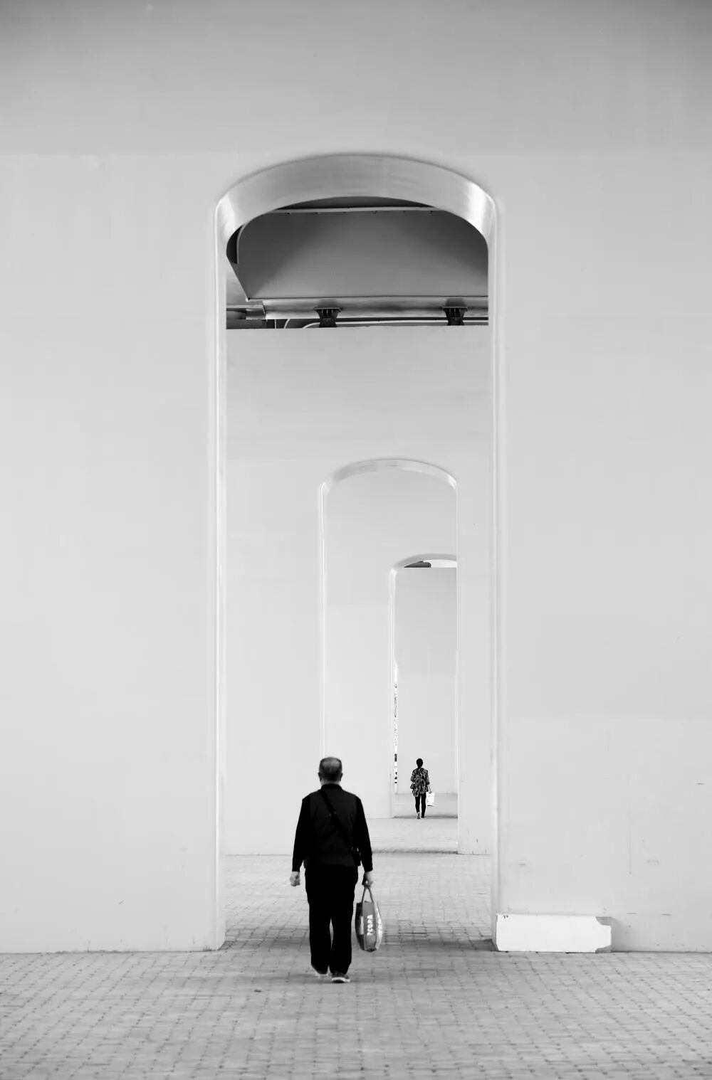 画面中天桥的桥墩形成了三重门,这本身就有一种渐变的延伸感。近处的人在第一重,而远处有个人和他恰好呼应,在第三重。让画面有非常好的延伸感。