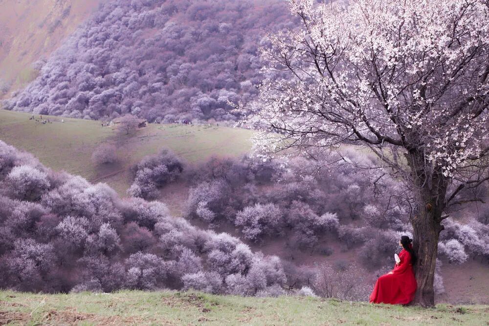 这是世界最大的野杏林,山坡此起彼伏,正好4月花开,让小姐姐穿上汉服拍了一张环境人像。后期用手机简单调了一下色。