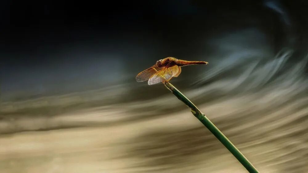一缕春日金色的朝阳、一滴露水激起的水波,完美结合,在长焦下放大,恍若在蜻蜓的注视下如丝般飘扬……