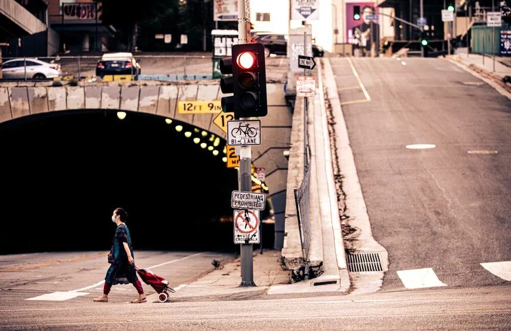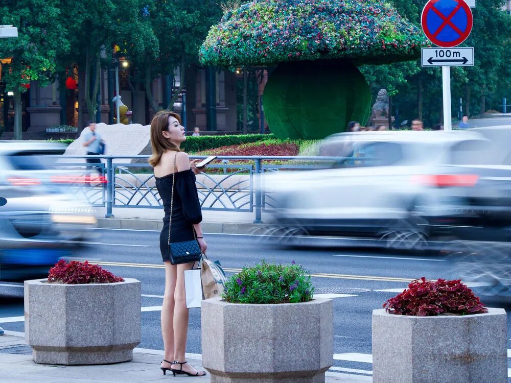 青岛街头偶拍,小姐姐正好在等穿马路,以车流为背景按下快门。