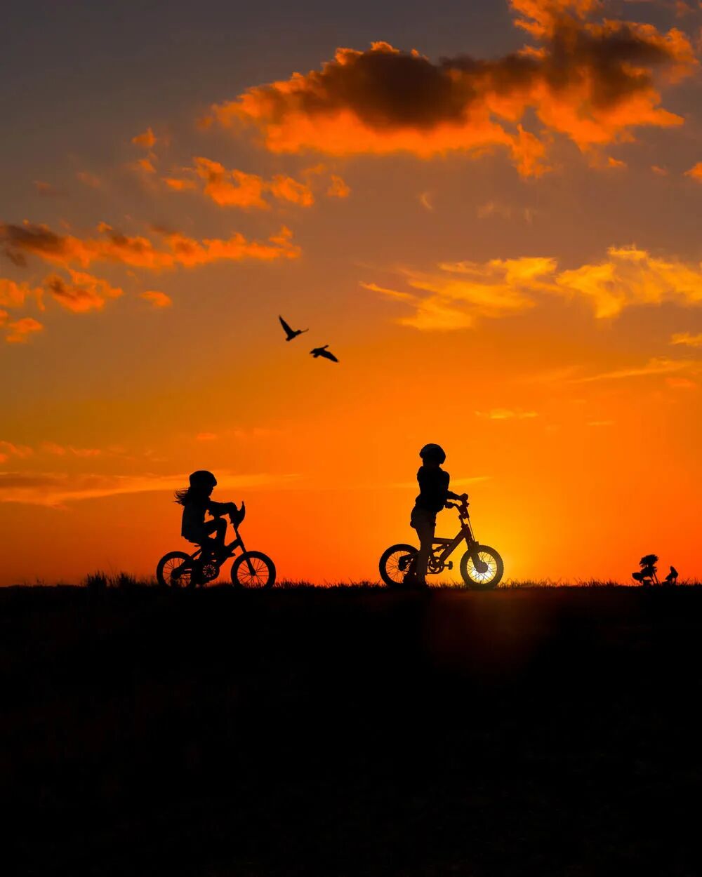 点评:画面抓取的瞬间特别好。两个人互动的瞬间被抓住了。表达出了哥哥照顾妹妹的。日落下,仿佛是最美好的时光。天上飞的两只鸟也很有寓意,不知道是真的遇到了还是后期的。不过特别好。