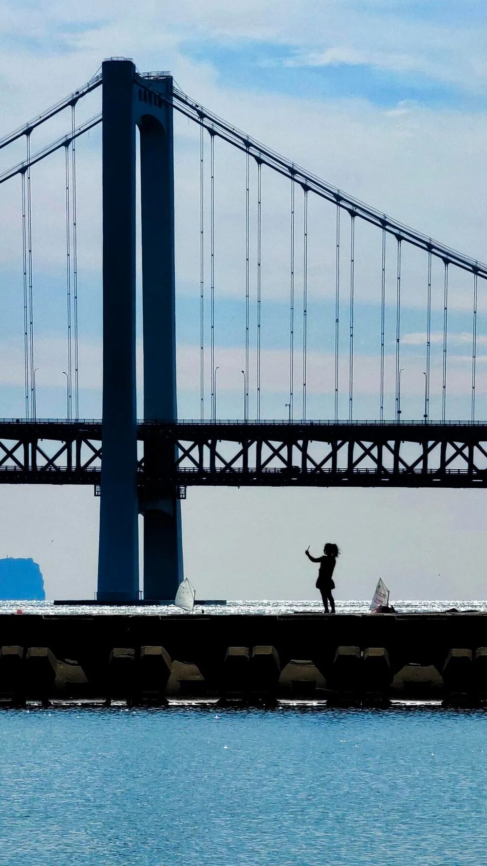 天气很好,走过海边时候看到大桥景色不错就想拍一下。按照校长强调了无数次的,等个人(✓),等个好状态(我觉得还行)。x50pro+长焦镜头5倍再裁切,后期压暗了暗部的亮度使对比更明显,更像剪影。实际取景范围更大,但是那样人就显得太小,而且旁边的人影响了画面。只不过手机长焦再裁切,这个画质确实……请校长点评。(删掉了之前的版本重新构图后期了一下)