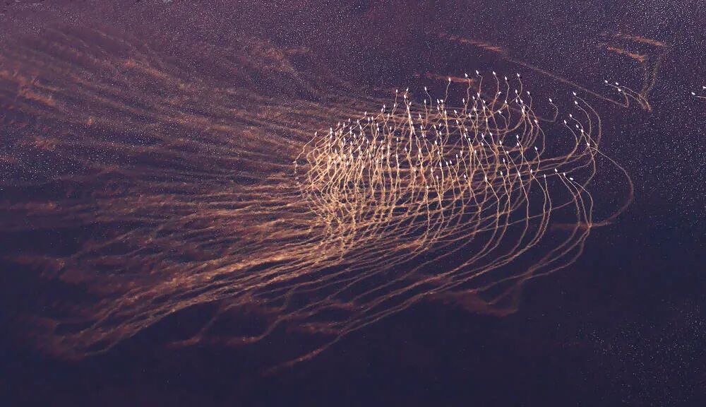 点评:航拍的动物,动物在画面中呈现小点,而它们运动的轨迹是线。