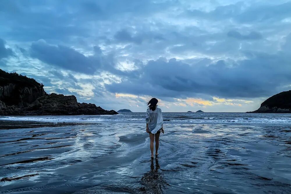 1、姑娘可以往远处再走走。拍摄角度变低。近景的水反光线条可以用于引导视觉。