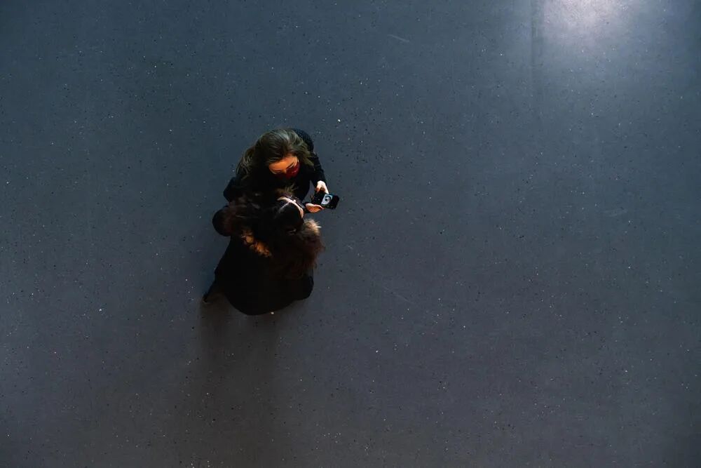 点评:尽管是从上面俯拍,但是俩人的状态不错,可以看到俩人在互动,挺好的。很妙的是,能看到手机中一个照片,是旋转楼梯吧,或者……反正是个挺好看的图。