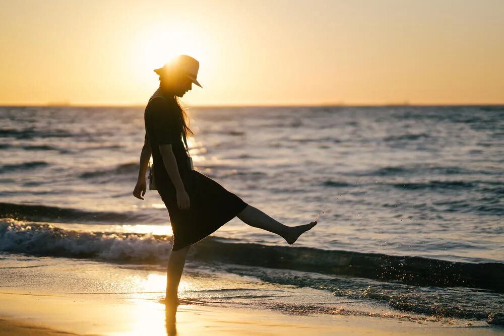 点评:海边夕阳很美,姑娘穿搭和动作也很美。虽然我觉得阳光还是强了点。但是整体确实给我很美的感觉。