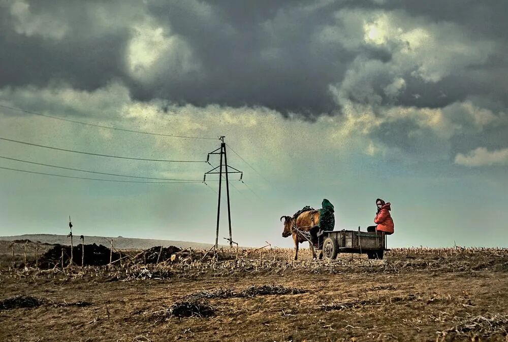 画面中的主要元素就是牛车上的俩人,不管是穿戴还是动作都很到位。然后一地的枯秸秆,电线杆子,看着就像能闻到泥土的气味一样。