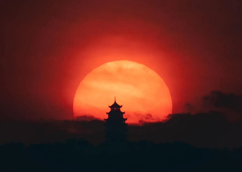 毕竟太阳这么大,中间有建筑物的剪影。看起来还是很震撼的。