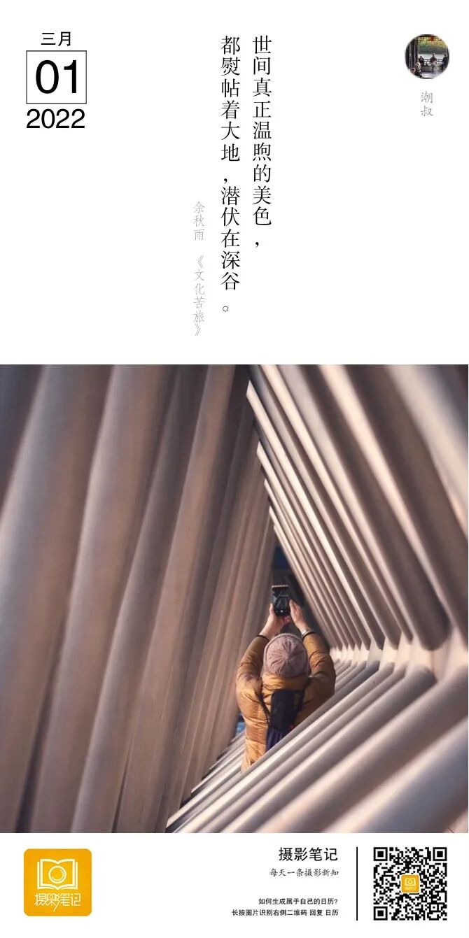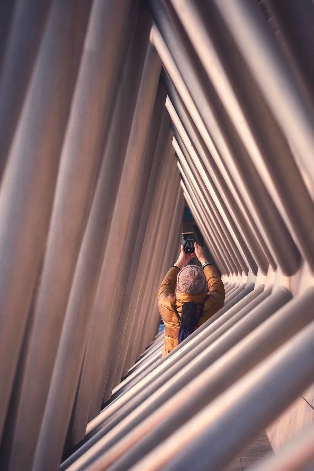 《简约与构成》去过很多次无锡大剧院,一直注意到这个韵律极强的钢结构构件,但都是空无一人。周末傍晚时终于等到有个人在用手机拍照,瞬间抓拍人物衣服的颜色和环境色很搭,是色彩统一好呢还是如果人物衣服的色彩更跳一点好呢?期待老师的点评指导