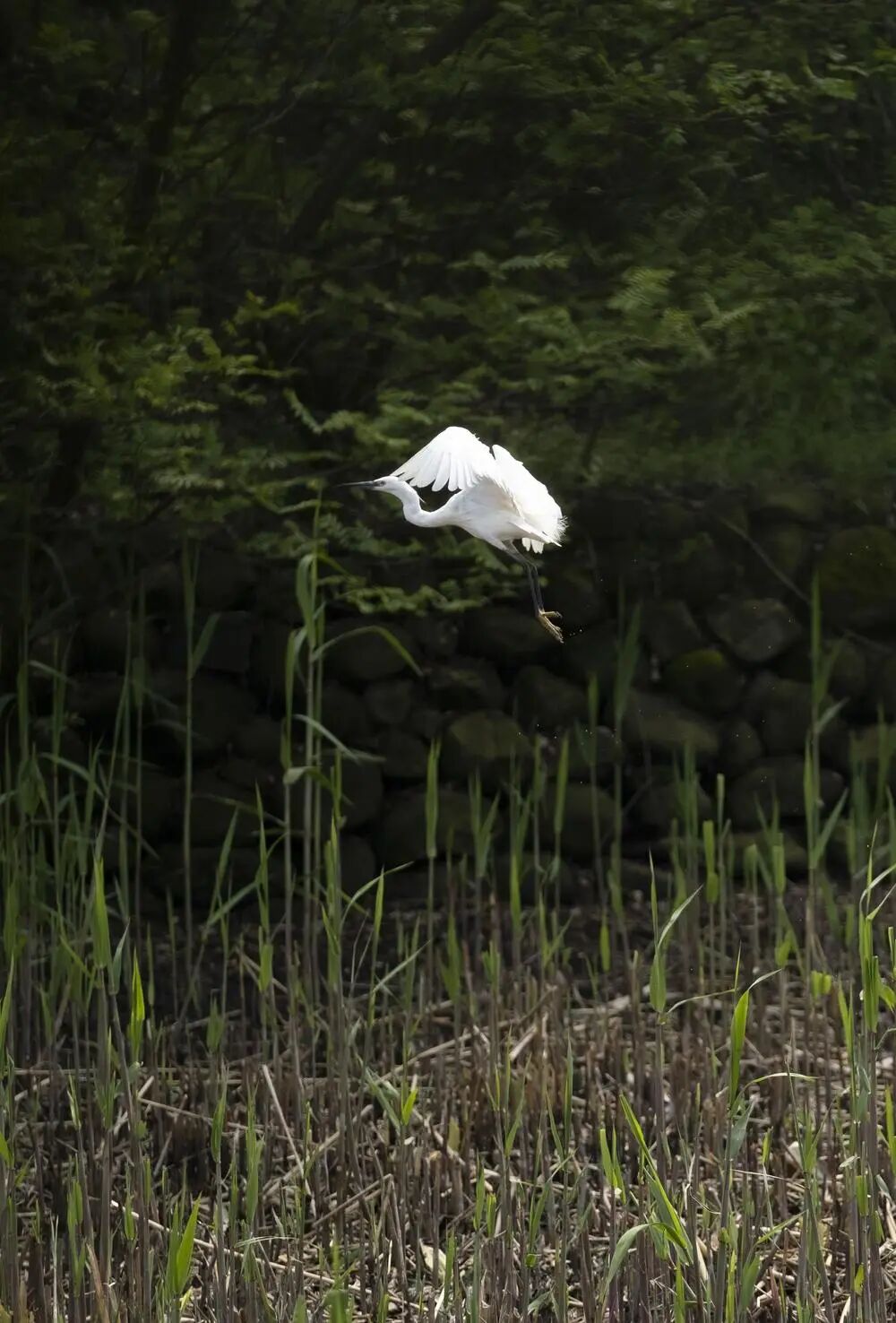 拍鸟习作,没有大长焦,只能200mm凑合拍——白鹭飞起的瞬间,避开了地面遮挡的芦苇,树林成为主体深色背景,能比较清晰映衬出白鹭的姿态和带起的水珠。