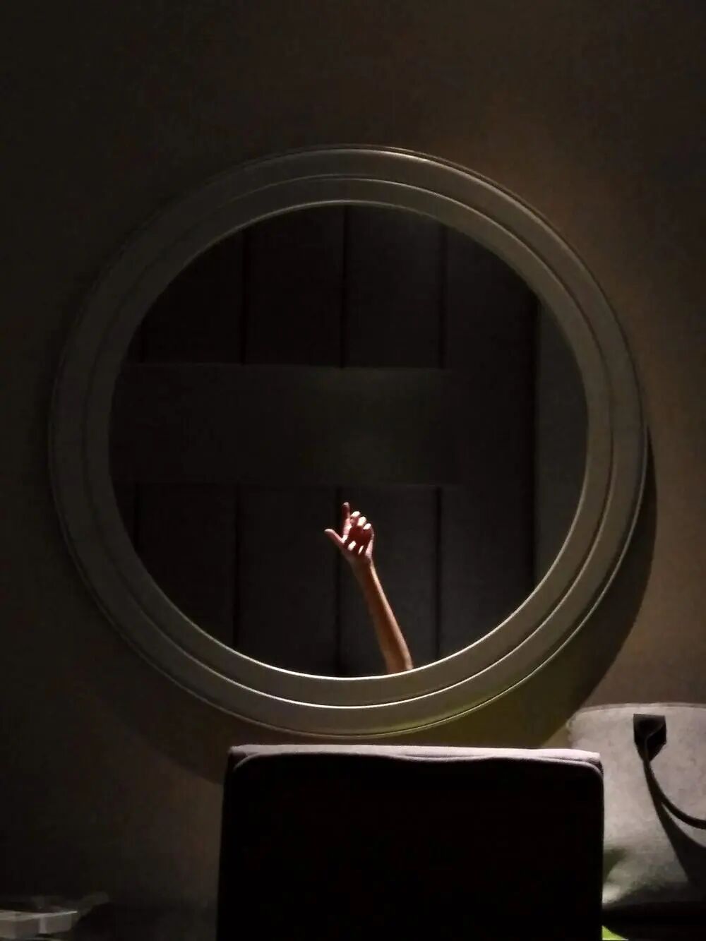 首先把椅子和你的包包都拿走。然后镜子里面的手最好有个什么道具,表现得符合你的感觉。最好有补光灯,让手和手臂的光线柔和一些。