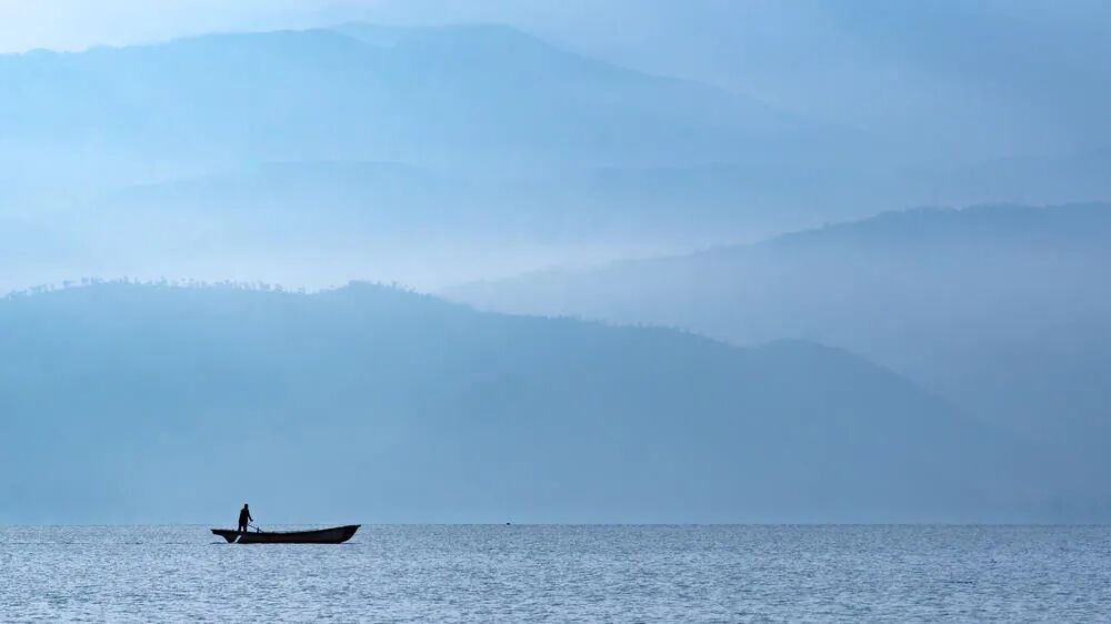 从画面来说,其实人物和船我觉得还可以再小点。主要是这样背景中的山以外还有合适的空间,现在山在背景中填充太满了。