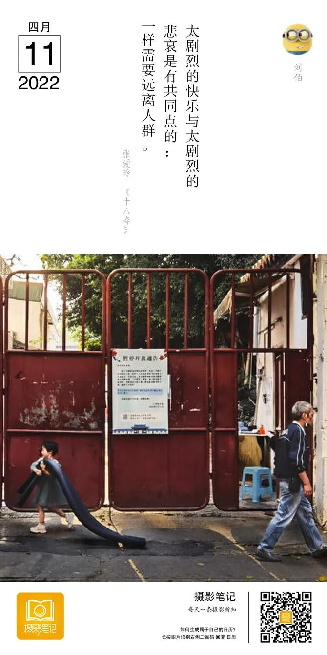广州开展全员核酸,为了响应号召,我下班也去做核酸检测了。完成核酸后,看见核酸点多面马路有一道红色的铁门,所以就用铁门做背景,等行人经过。一共挑出来两张照片。这张是以一个抬着水管的,奔跑着的小女孩为主体(那位老人家无可避免地入镜头了,如果等老人家走出画面的话,小女孩早就跑走了。)