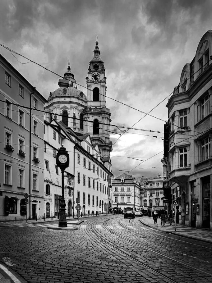 还是布拉格的街道接昨天的那张同一条街 不同的视角这张街道两边的建筑平平主要是两个塔楼很有特点地面有轨电车逐渐消失的轨道空中纵横交错的电线都是这座老城的特色也是我个人比较喜欢的元素后期转黑白调整透视加了暗角