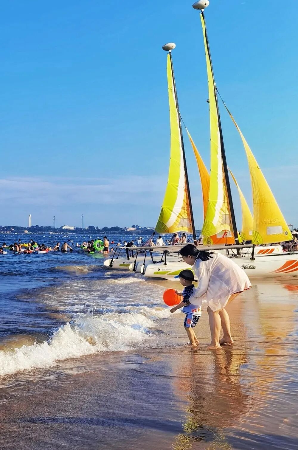 《 宝贝勇敢些!》——去年夏天在东戴河度假,傍晚散步时看到一对母子俩海边戏水,身后的黄色风帆在蓝天大海衬托下分外好看,倒影映在被海浪冲刷过的海滩上,构成一幅温馨有故事的画面,赶紧用手机拍摄下来。后期略做调整,敬请老师和学友点评,谢谢!