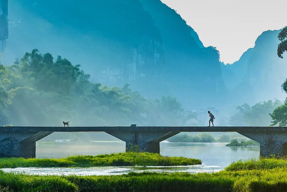 雨过天晴,江上有一座桥,桥后有村庄,远处有山,还有雾,景色非常美,只等有人从桥上走过。老人和狗开始从左边到右边,桥上还有其他人,等到老人和狗返回时,桥上再二人他人,老人打着赤膊,弯着背,肩上搭着毛巾,小狗一路小跑,一会儿停下来回头着主人,很有意思。遗憾的天空惨白。请各位老师多多批评指正,谢谢!