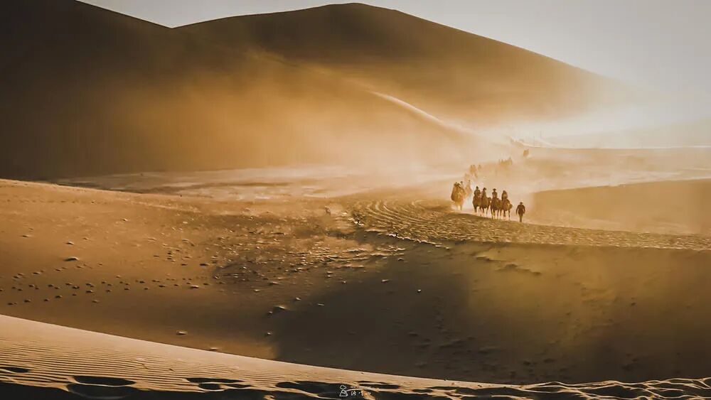 敦煌,鸣沙山。夕阳下一支驼队迎面走来,夕阳打在驼队及其扬起的沙尘上,骑在骆驼上抓拍,后期裁剪,强化剪影和扬起的沙尘。请老师和同学们指正,谢谢!