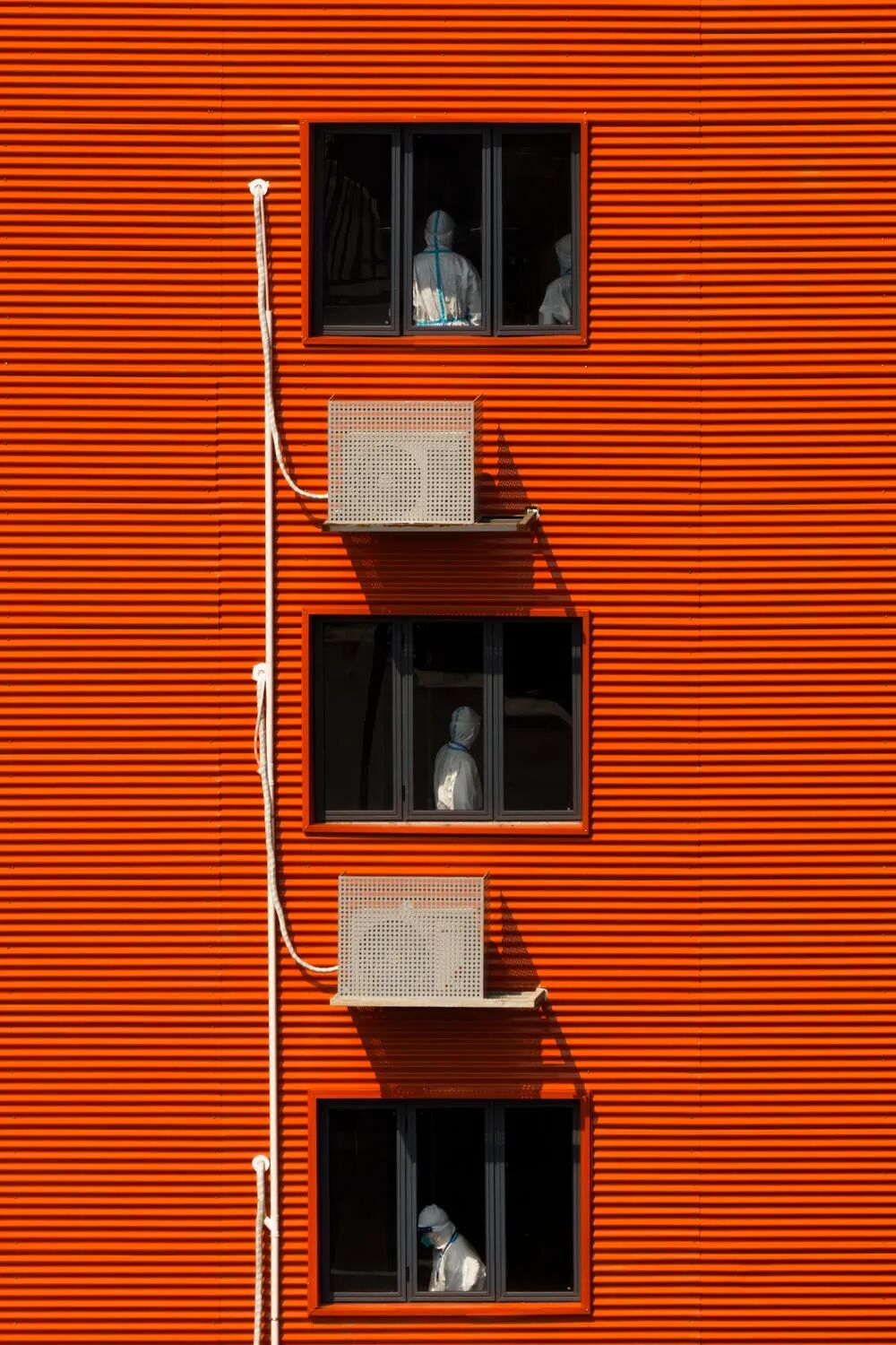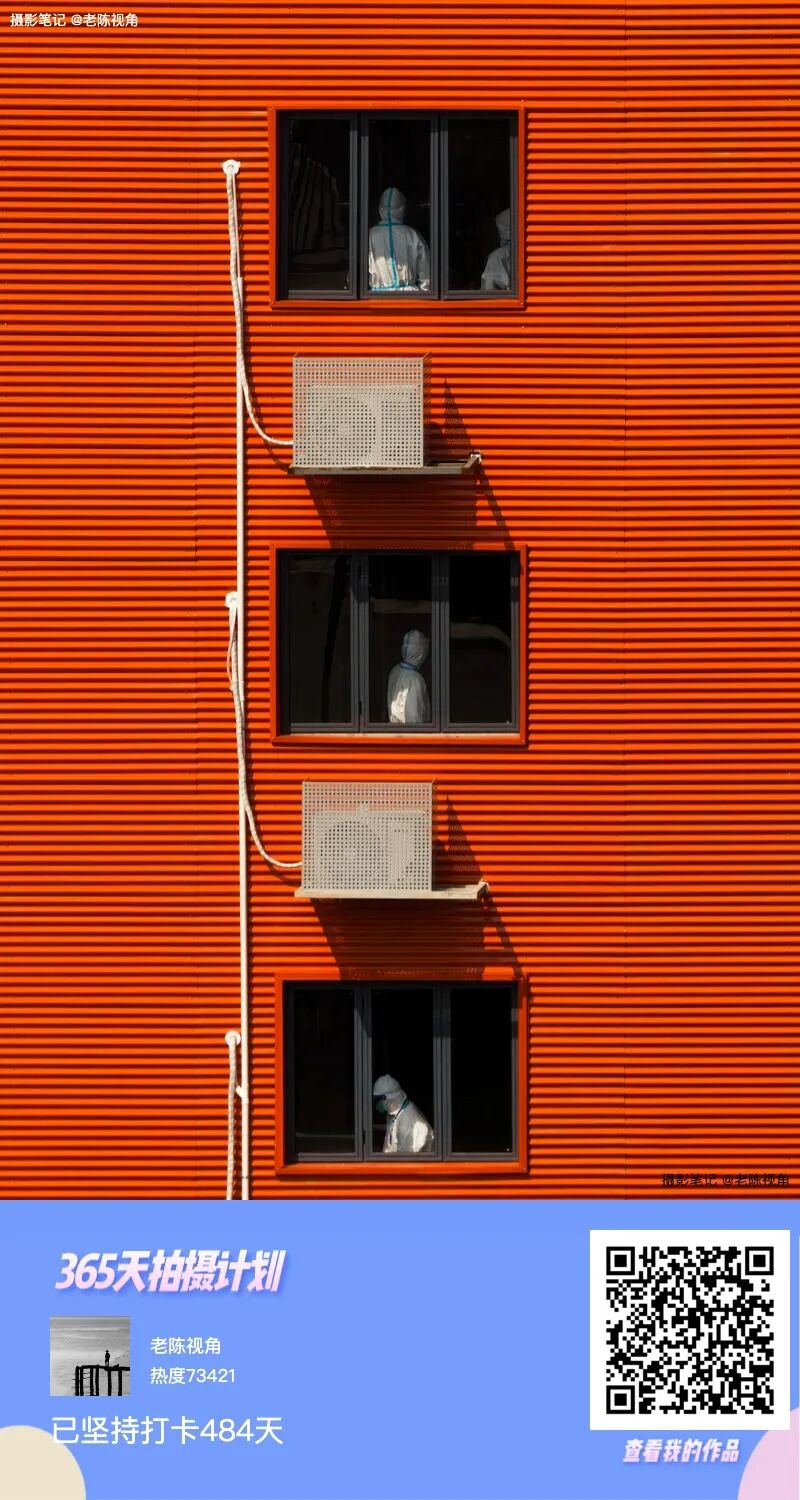 刚建成即投入使用!利用周日,守在阳台上,从早晨六点半阳光开始照到窗口到将近十点阳光离开窗口,一直等待拍摄了100多张片子,希望有些有趣或者有意义的画面。最后选择这张片子的理由很明显,正好每个窗口都有大白,而且正好阳光都照到他们身上局部。