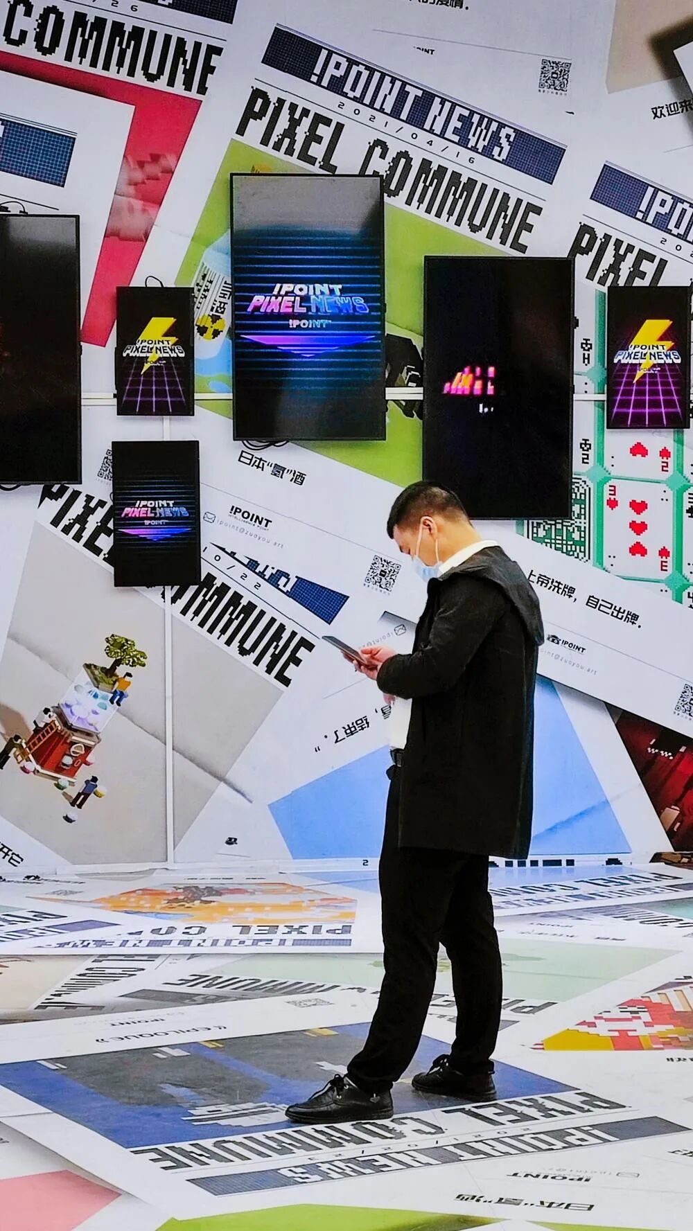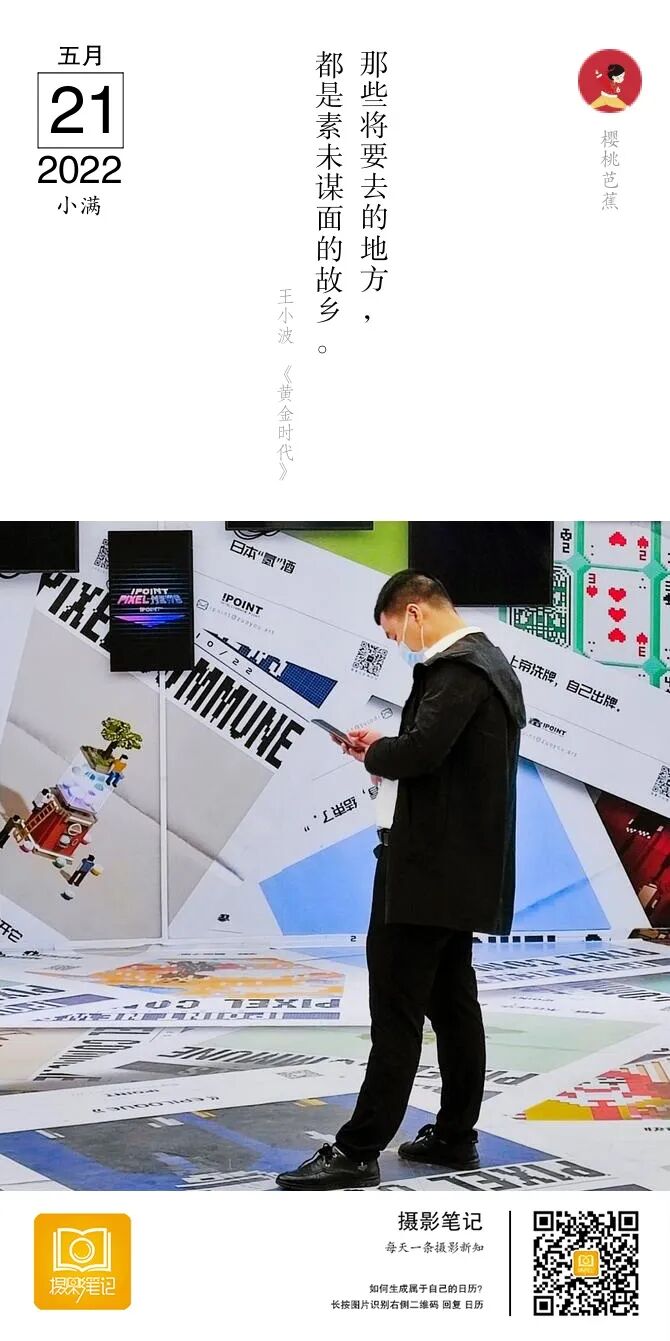 点评:看到照片给我的感觉也是这样的。铺天盖地,都是信息。画面中的人物也是在看手机,获取什么信息。