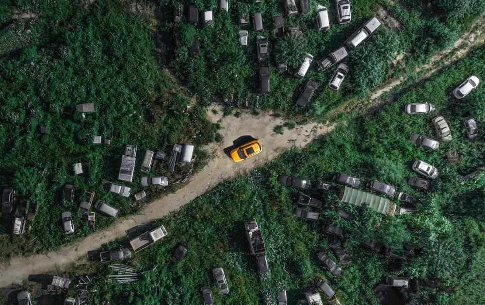 土路、周围的荒草和树。散乱的车。点睛之笔就是黄色的车。