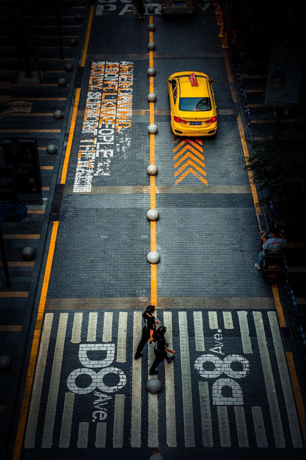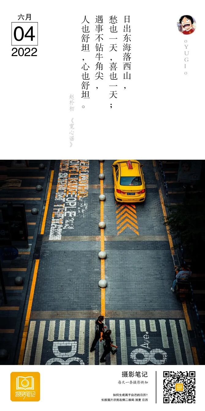 画面中的两个人状态非常好,迈着步子的瞬间。黄色出租车的位置也很合适。