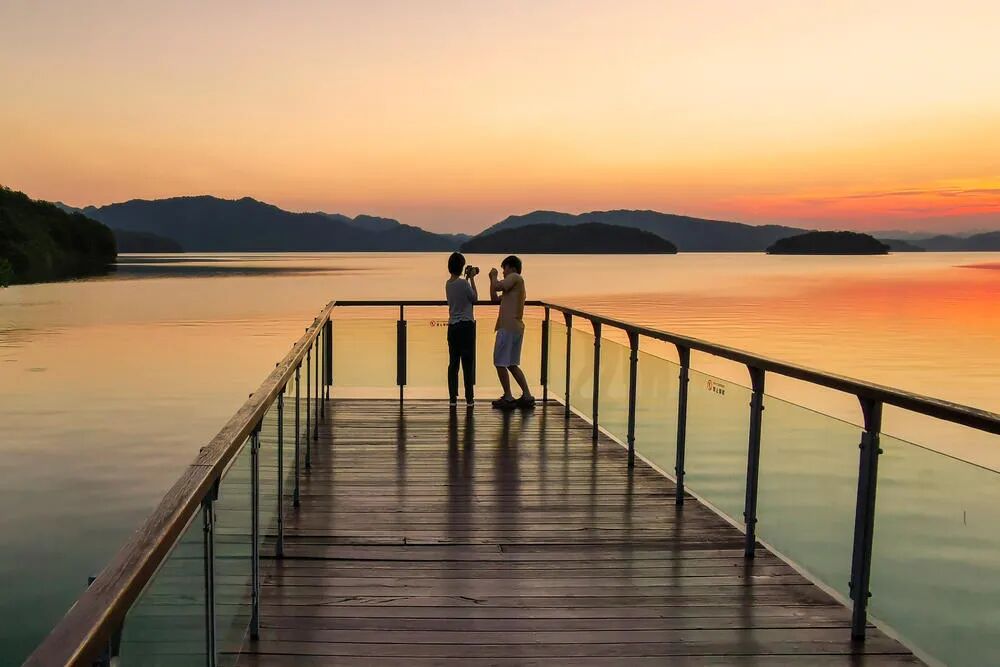 《日落时分》华为手机mate20X拍摄太阳落下山了,满天满湖还是一片金色,赶到拍摄湖景的好机位----近水走廊。一对情侣正占居着黄金位置,我不便打扰,况且这走廊应该是此时最好的前景,自然他们也成了我镜头里的模特。普通模式拍摄。后期:通过提高亮度,暖色照片滤镜等加强日落时分的光色效果。裁切掉左边部分岸边景物,使人物居中,也使湖面环境显得更广阔。