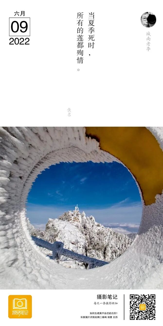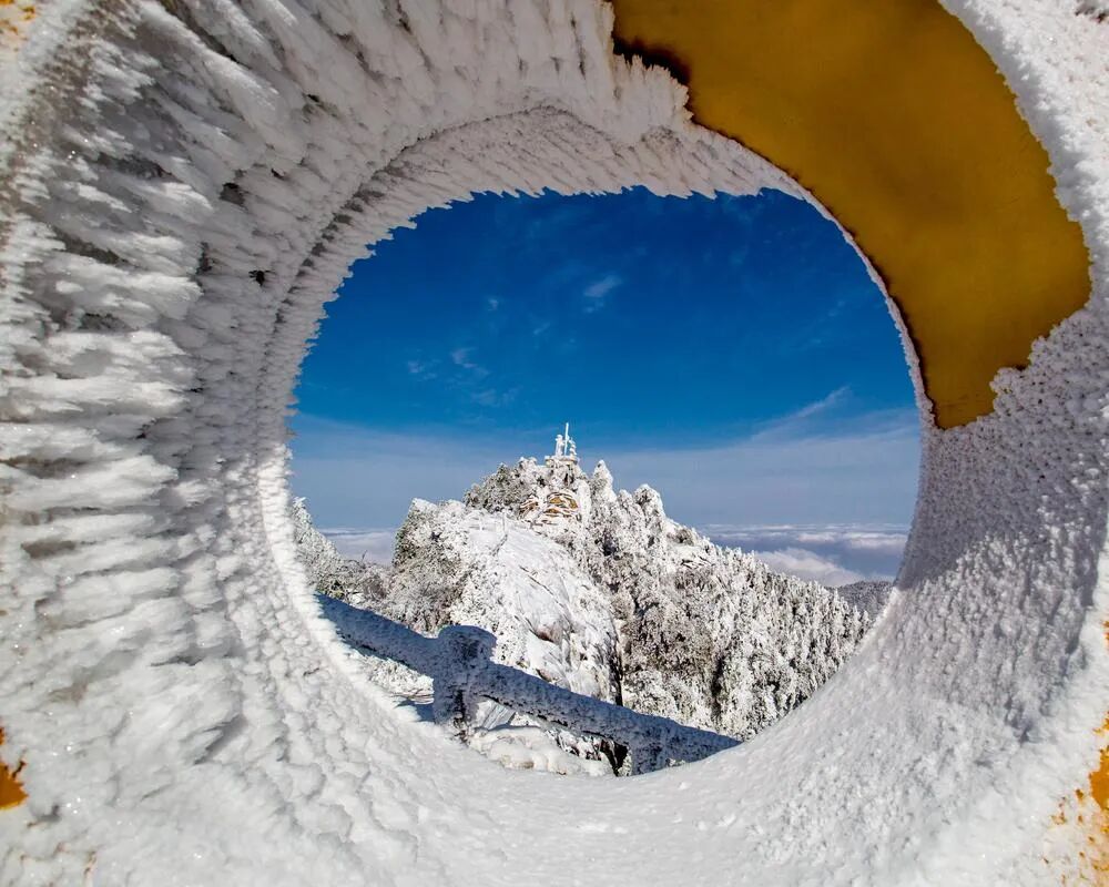 点评:九华山下雪真的是漂亮。晴天的蓝天也是很棒。一片雪景从一个洞看过去,思路也不错。