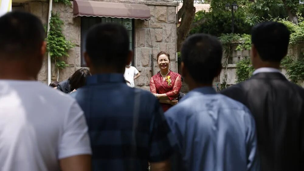 喜悦。婚礼现场,妈妈看着女儿幸福地出嫁,心里有说不出的喜悦。透过四个着深色装男人的肩膀,抓拍着红装的妈妈的喜悦笑容,希望有对比。