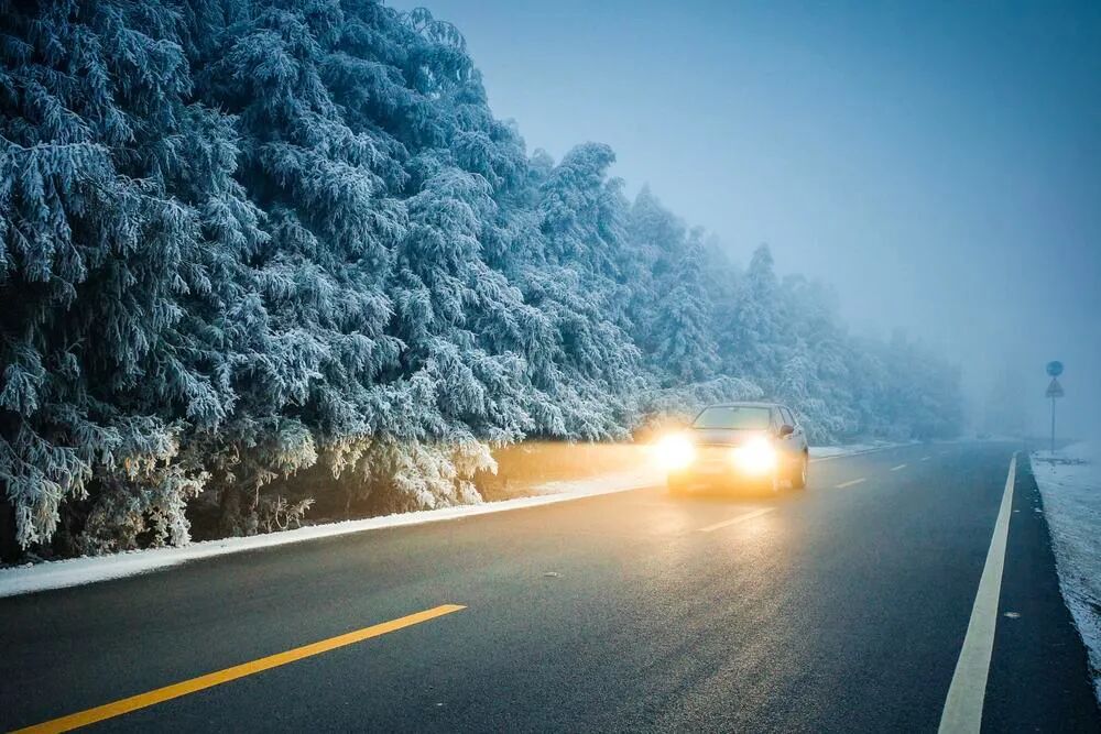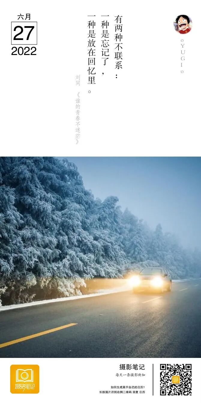 点评:非常漂亮的一个场景。雪景,暗光,有雾。车灯的黄光和环境的冷色成了一个对比。