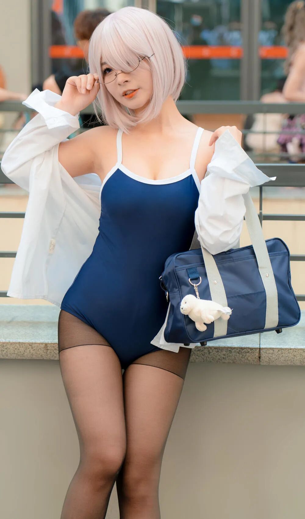 漫展周围有很多很多coser可以让大家拍摄。那么咱们首先就是对于拍摄对象有个选择。我不知道这是不是一个什么角色。反正我觉得死库水配黑丝袜怪怪的。
