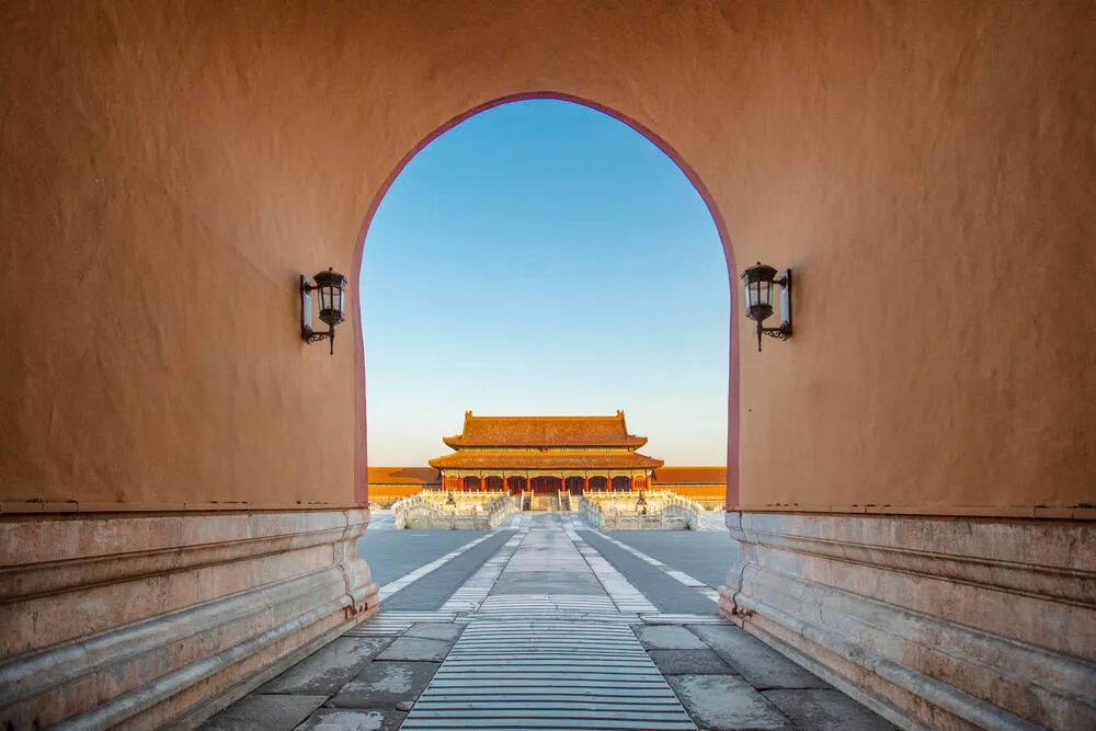 打卡,故宫午门入口一早进入故宫,游人很少,以城门为洞为前景,框架构图拍摄,后期提亮暗部,压暗天空,修掉墙上的监控摄像头。