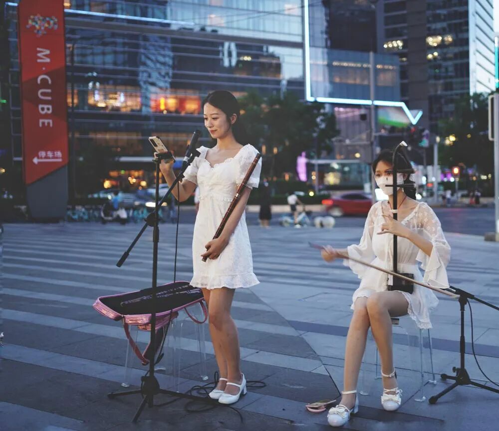 昨天发了街拍的小姐姐在街上表演的照片,有同学说今天来一张吹笛子的。可惜的是还没有等到吹笛子就下雨啦。今天发两个小姐姐一起表演的照片,坐着的小姐姐正在拉二胡,带着口罩,吹笛子的小姐姐在等着表演。唉……怎么就下雨了呢?说实在的我的镜头是定焦35的,街拍有点尴尬,好在小姐姐很友好,并没有说什么。