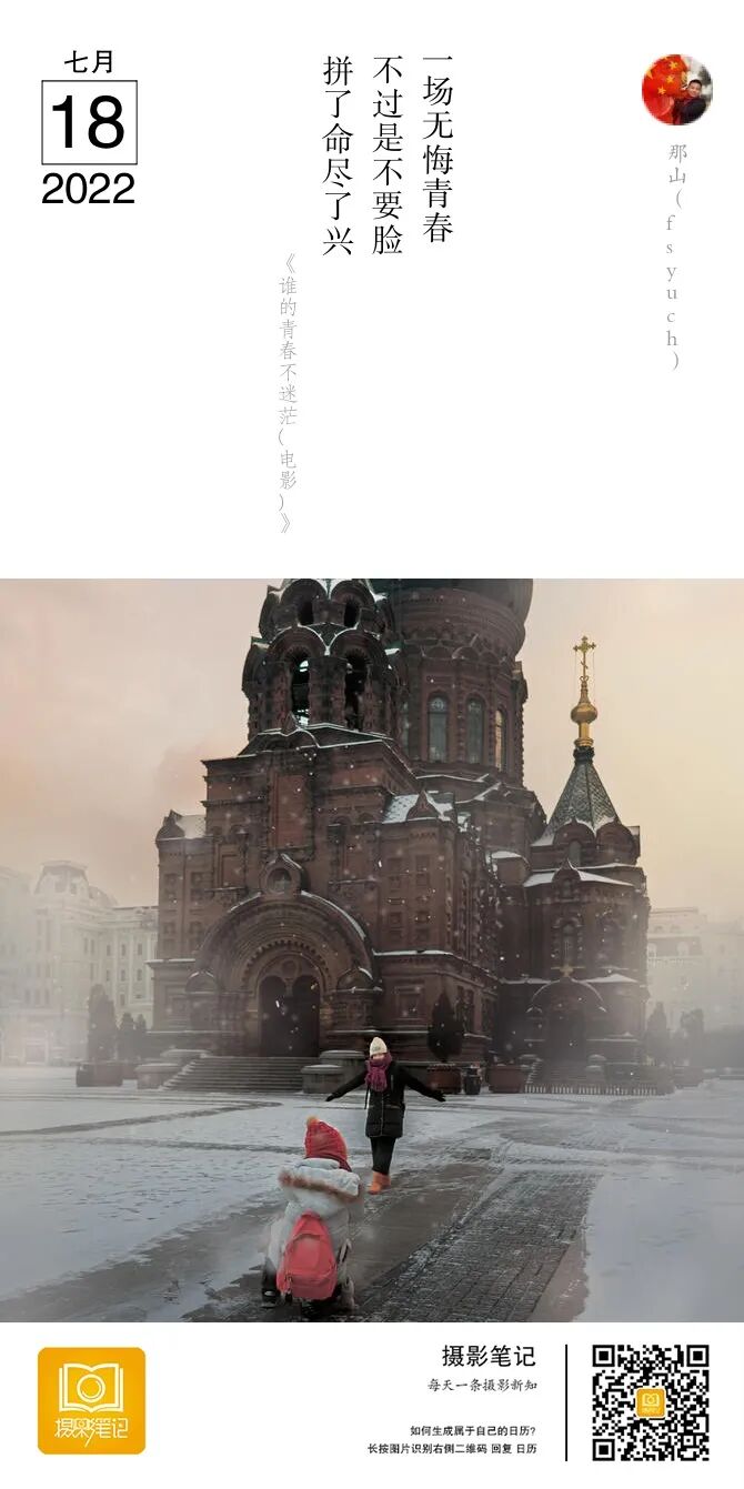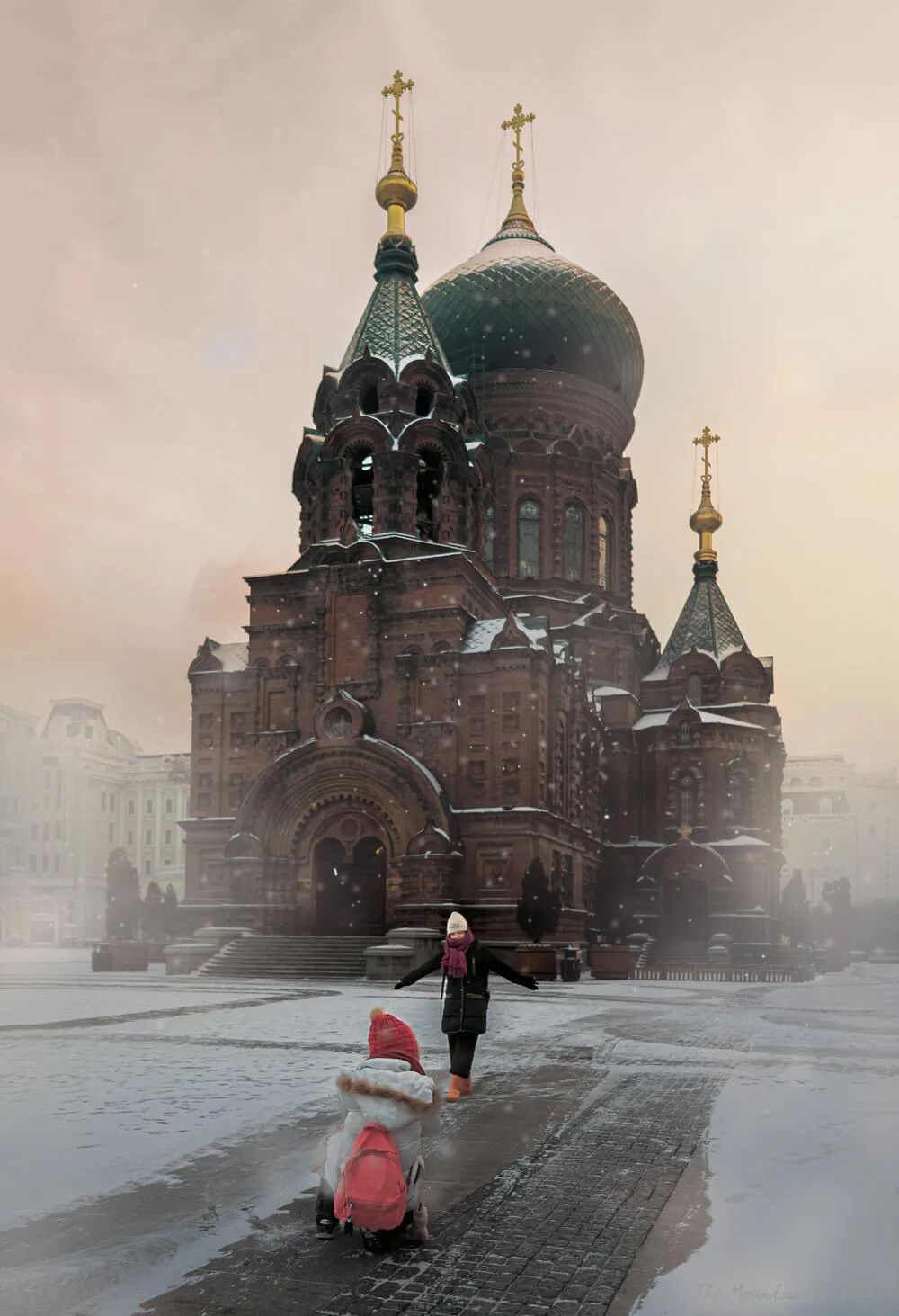 黑龙江哈尔滨圣·索菲亚教堂前期拍摄“又见雪飘过飘于伤心的记忆中......"一首陈慧娴粤语歌《飘雪》勾起了年轻时的记忆下雪对于南方人来说有一种特别的浪漫情怀圣•索菲亚教堂是哈尔滨游人打卡地清晨(相机记录时间有误,实际是早上7点左右)漫天风雪(飘雪是后期效果,增加飘雪的浪漫气氛)天空映出红霞两个小姐姐在教堂前互相拍照留念我也正在此时按下快门有意思的一个组合我拍她们她拍她和教堂后期调整思路全片调出清晨阳光的微黄调增加飘雪后期效果增加晨雾遮挡画面两边的建筑物