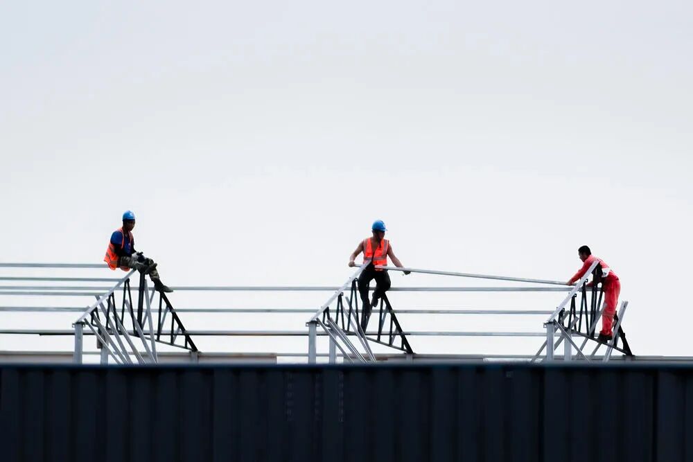 屋顶施工。下班路过一即将开工的工地,工人们正在搭件临时工棚。有人骑在屋顶上正在安装房梁,不错。在几百米外找到一个临时停车位,抓起相机往回跑。然后,拍摄时发现镜头错了,当时挂机的是一个85定!但工地又进不去,只能远远拍,然后后期裁剪太多了!而且天已经灰暗了,画质比较差。但画面还是很有意思,三个人有互动。但因为隔着围墙,工棚只露出一个屋顶,只能举着相机,还是不能避免围墙格挡进入画面。