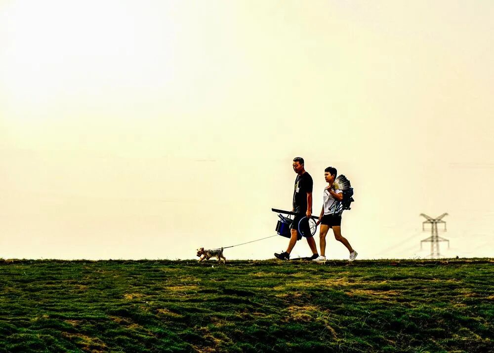 傍晚、晚饭后带着宠物和爱人,抄上渔网和渔具去钓鱼也是周末解压的方式!后期因天色尚早,人物本身就不是剪影,所以沒必要修成剪影,但多余的电线还是要修的。昨日摄于成都市温江区鲁家滩!