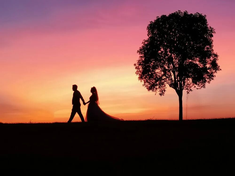 点评:天色极美,这棵树也和好。两个人穿着结婚的礼服。感觉是拍婚纱照的小夫妻。