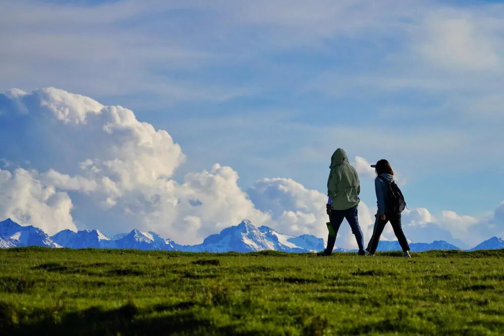 点评:这个场景非常漂亮。画面中有两个人也很好。但是近处草原,配上远处的雪山就更好了。这个角度拍摄过去,远处雪山很低。所以我想,会不会俩人继续往前走,前面可能会有下坡路,然后远处的雪山可以展现得更好一些。