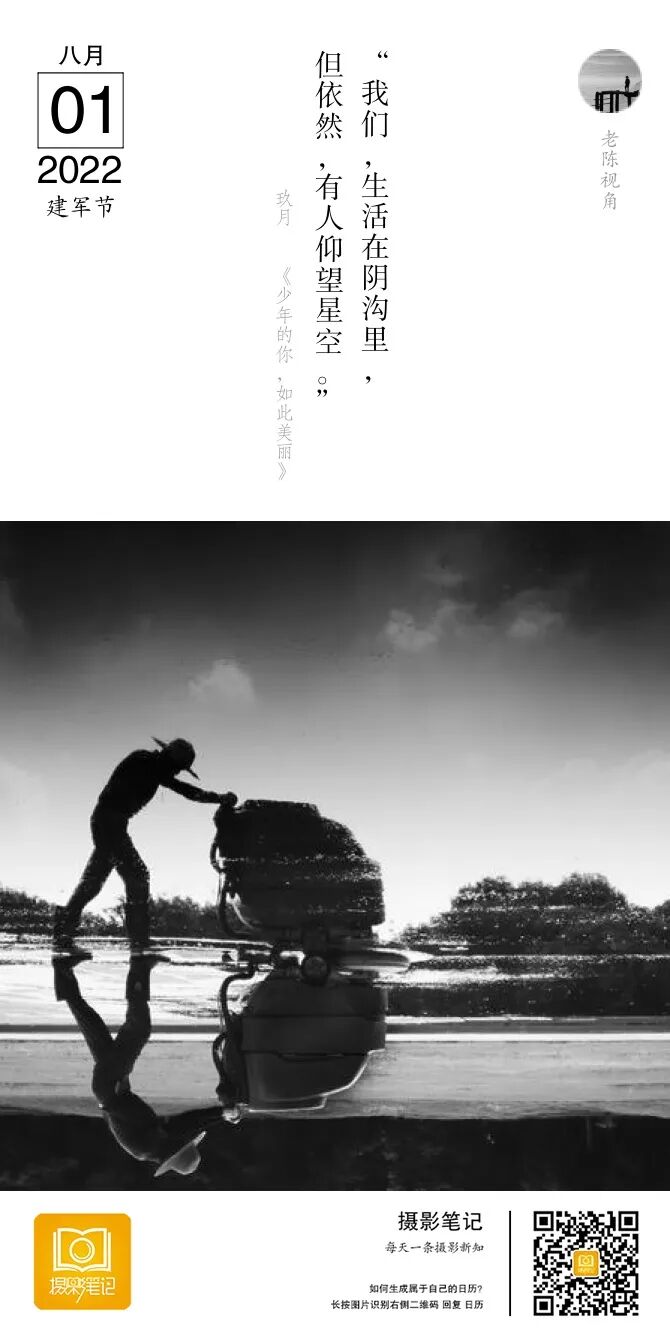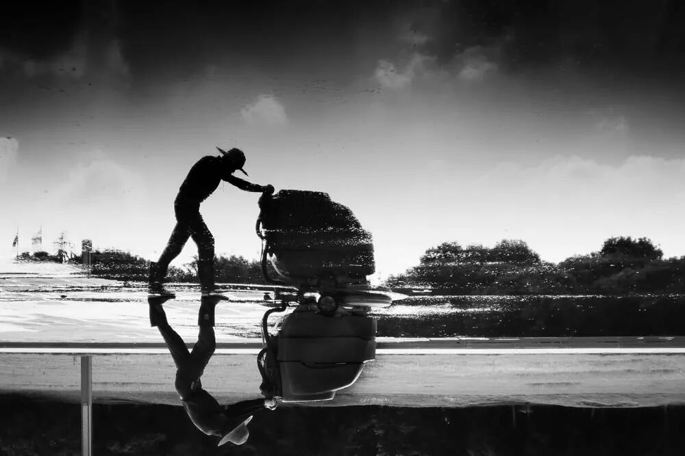 科技园的景观水池,清洁工人正推着清洗车,利用周末时间清理水底淤泥。淤泥很厚,清洗车常被淤泥陷住,所以工人推的时候很吃力,烈日下满头大汗。拍摄时利用水面做了倒影。稍提高了一些机位,否则人会进入树的倒影里。想表现一种辛苦的状态,所以后期将照片进行了翻转,利用天空倒影的阴影形成天空压迫感,有一种不堪重负的感觉。