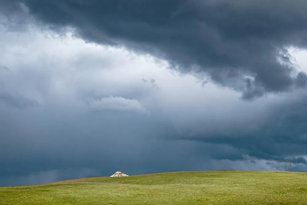 自驾路上,前方黑压压的感觉快要下雨,突然惊奇地发现有一座经幡塔,还有阳光照耀着,感觉很神奇,就把快门速度调高定格了下来,自然界的神奇!