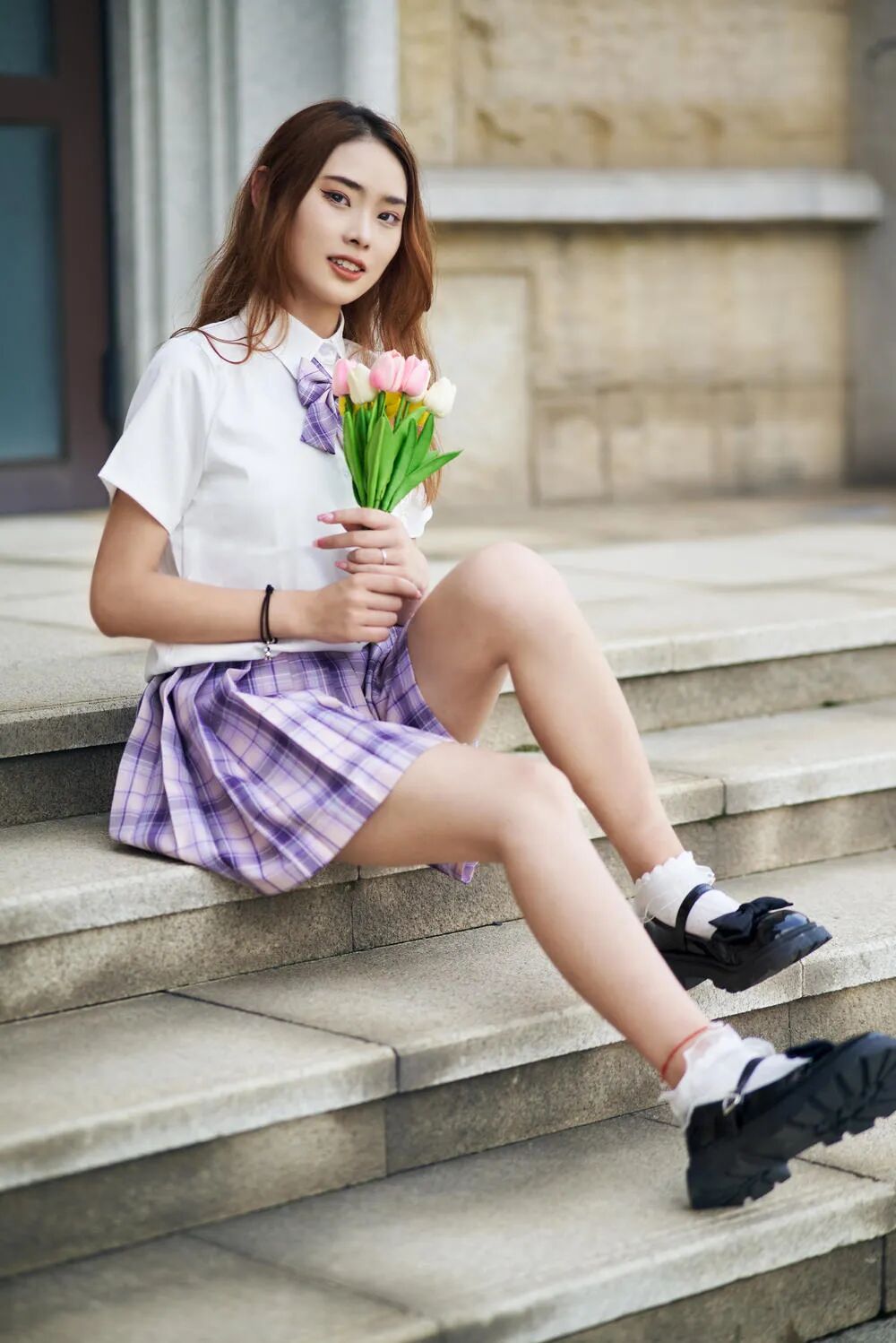 说说取景吧,姑娘打扮算是干净利落,环境其实也干净。问题是姑娘手里捧着的花其实……我觉得在一个感觉还挺像校园环境的场景中,抱着书比抱着花好。尤其是这个花有点艳俗。