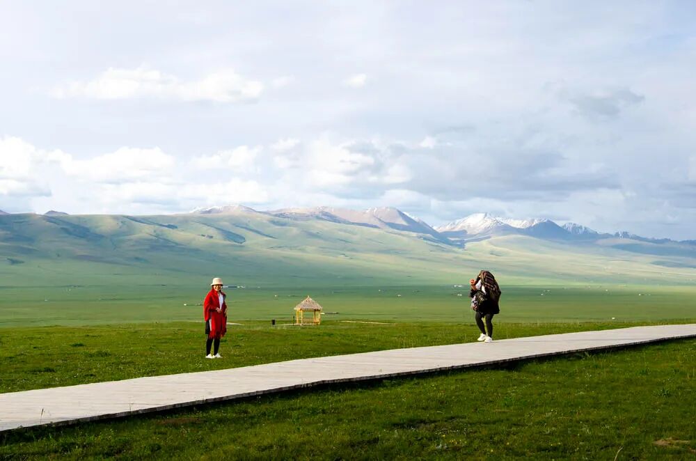 点评:这个场景还是很不错的。草原啊,远山啊,天上的云啊。虽然我不太喜欢那个小亭子——因为旁边有垃圾桶,本身也不好看。但是在这边真的,你有时间等等云影,那中长焦拍点什么,都会很好看。