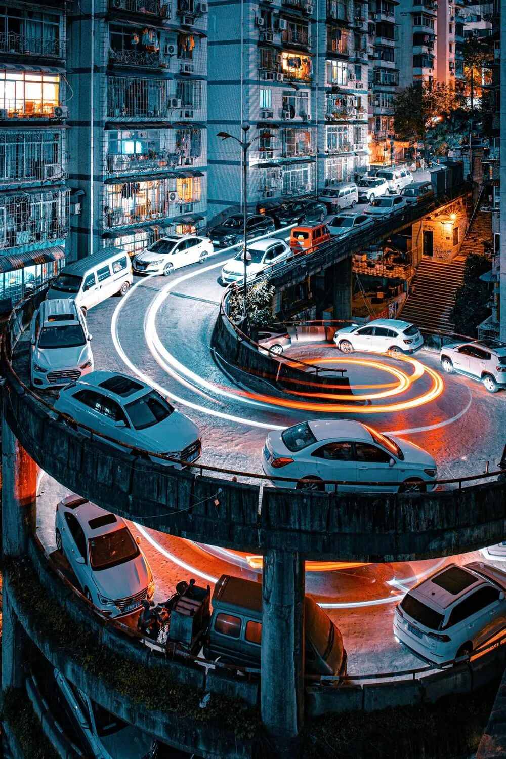 点评:这个地方确实很好看。一个不太新的小区,一圈路边停车,一个螺旋的马路。特别重庆。