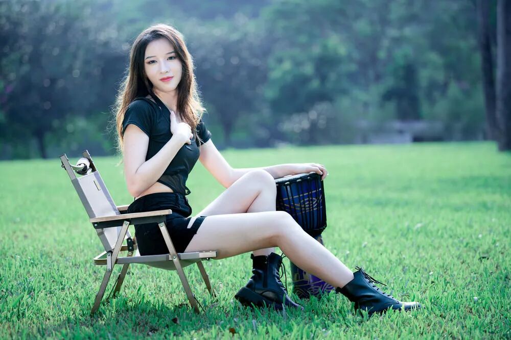 点评:姑娘是个好姑娘,弄个小椅子,到公园草地上敲小鼓。