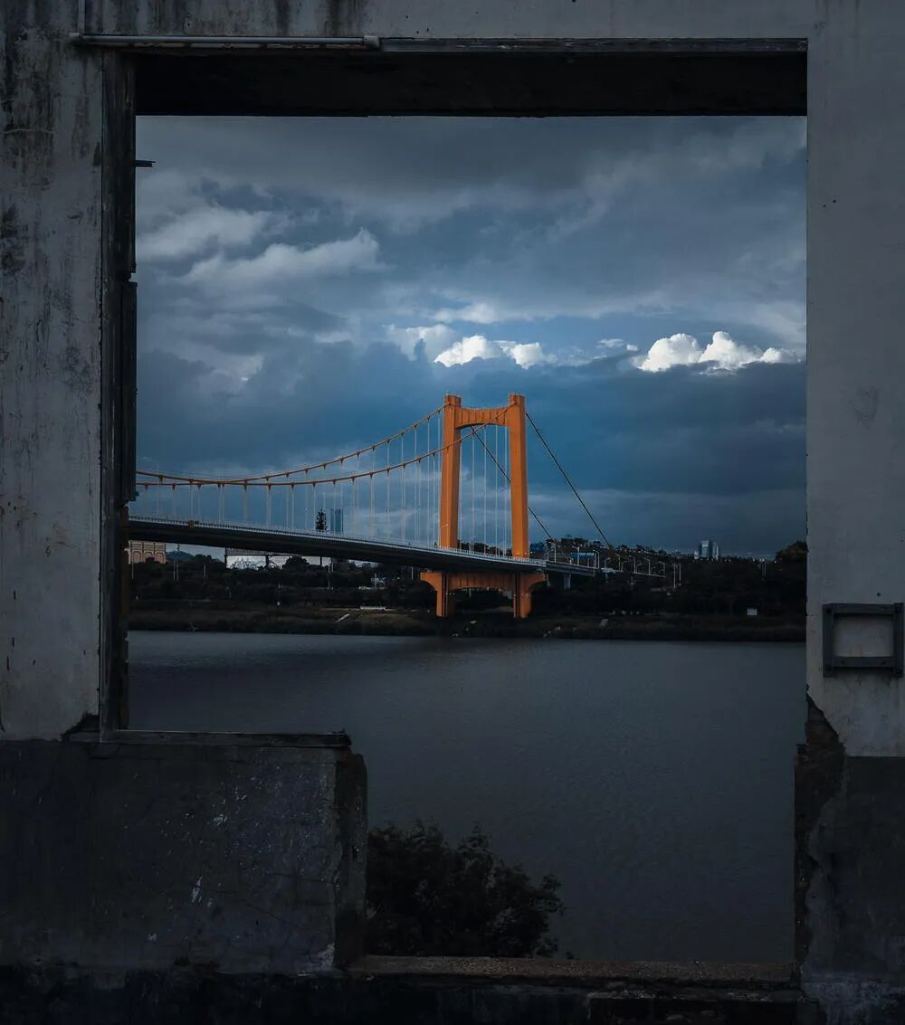 远处城市建筑一般般,但是因为比较黑,自然被忽略了。这个桥的颜色也亮,所以格外突出。加上能看到一点蓝色的天空,还有很亮的云。黄色和蓝色的对撞也是很好看的。虽然是撞色,但是因为黄色的明度低,蓝色的纯度低,所以异常舒服。